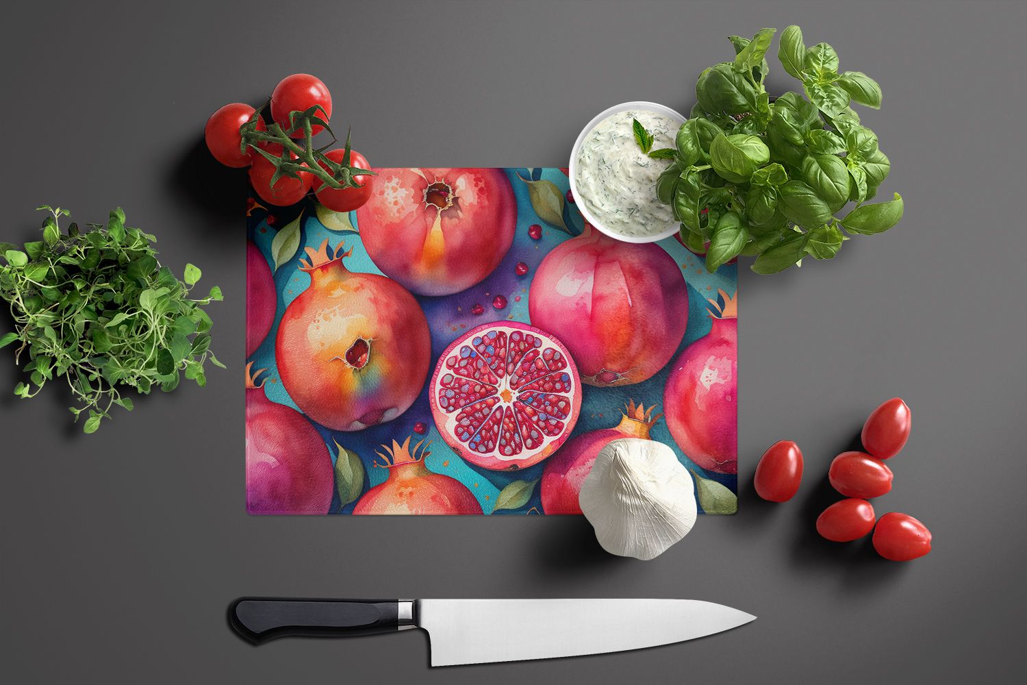 Glass Cutting Board featuring breed specific Pomegranates artwork. Introduce your kitchen to the vibrant, large Decorative Glass Cutting Board from Caroline's Treasures. Crafted from resilient tempered glass, this board is not only a utilitarian necessity but also a colorful art piece. With its generous dimensions of 15 inches in height and 12 inches in length, it offers ample space for all your cutting needs. Every piece showcases captivating artwork from distinguished artists, bringing an aesthetic edge to your kitchen. Beyond its attractive design, this cutting board ensures your countertop stays pristine and unscathed, owing to its heat-resistant properties. Engineered with user convenience in mind, it features non-skid feet for stability, and rounded corners for additional safety. Its robust construction renders it virtually unbreakable, guaranteeing longevity. The board comes with protective feet bumpers, maintaining its position during use. This product is recommended to be hand washed only. Proudly printed and assembled in the United States, this cutting board exemplifies superior craftsmanship. With Caroline's Treasures' Decorative Glass Cutting Board, you're investing in a blend of functionality and artistic flair.
