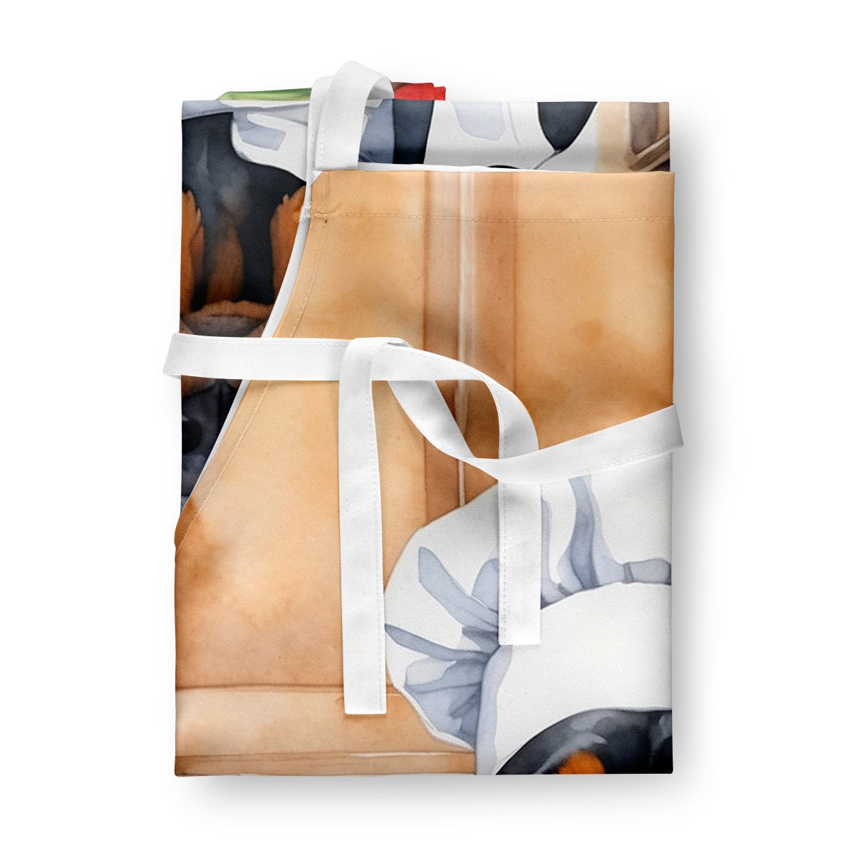 Apron featuring breed specific Black and Tan Coonhound artwork. Elevate your cooking, baking, and grilling experiences with our versatile Kitchen or BBQ Apron. This Bib Style apron isn't just limited to culinary activities - it also serves as an excellent baking apron, artist apron, server apron, gardening apron, or even a dog grooming apron. The apron showcases vibrant full-color artwork contributed by one of our talented artists, bringing a dash of style to your daily tasks. With dimensions of approximately 27"W x 30"H, it provides ample coverage to protect your clothing from spills and splashes. Our apron is meticulously crafted from 100% Ultra Spun Polyester, known for its durability and lightweight nature. The apron comes with white tie straps, ensuring a comfortable and adjustable fit for all. It's a perfect choice for kitchen apron enthusiasts, whether you are a woman or a man. Designed for easy maintenance, this apron is fully machine washable. The quick-drying polyester material actively reduces staining, keeping your apron looking fresh and new for longer. Our beautifully designed apron isn't just a functional kitchen accessory - it's a fashion statement in the culinary world!