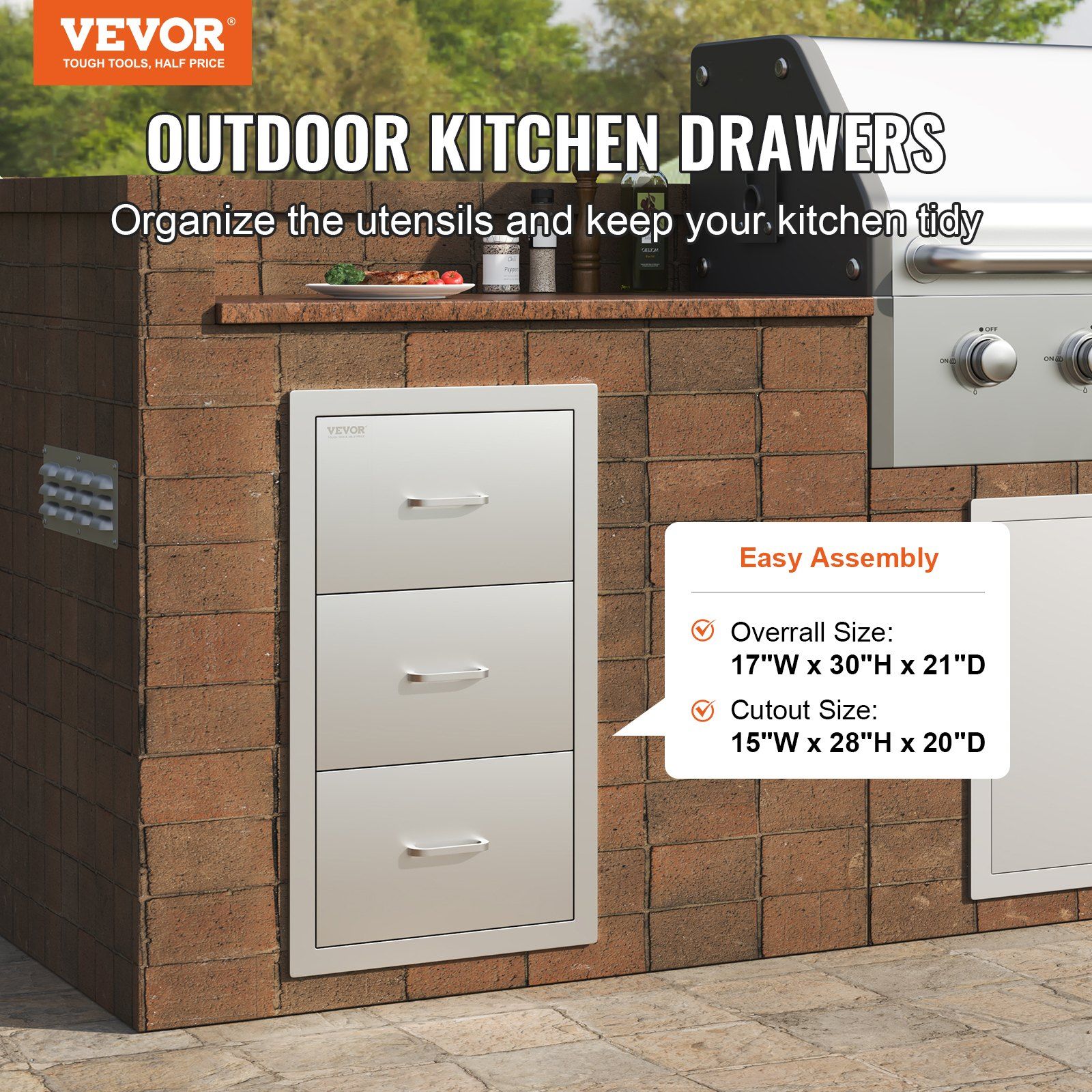 It is commonly used in outdoor kitchens, BBQ tables, and grilling stations to store cookware, tableware, and other frequently used items.