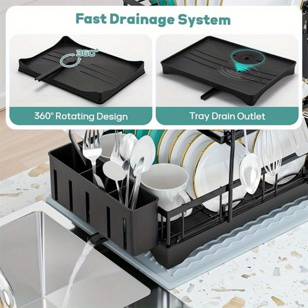 KEEP YOUR COUNTER CLEAN AND DRY EFFORTLESSLY – Water belongs in the sink, not on your counter. With the 360° automatic drainage, our drying rack kitchen ensures spotless surfaces every single time. Take control of your kitchen, order now!