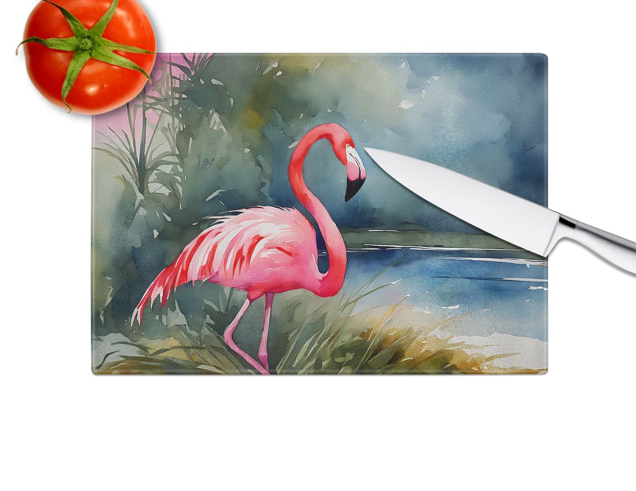 Glass Cutting Board featuring breed specific Flamingo artwork. Introduce your kitchen to the vibrant, large Decorative Glass Cutting Board from Caroline's Treasures. Crafted from resilient tempered glass, this board is not only a utilitarian necessity but also a colorful art piece. With its generous dimensions of 15 inches in height and 12 inches in length, it offers ample space for all your cutting needs. Every piece showcases captivating artwork from distinguished artists, bringing an aesthetic edge to your kitchen. Beyond its attractive design, this cutting board ensures your countertop stays pristine and unscathed, owing to its heat-resistant properties. Engineered with user convenience in mind, it features non-skid feet for stability, and rounded corners for additional safety. Its robust construction renders it virtually unbreakable, guaranteeing longevity. The board comes with protective feet bumpers, maintaining its position during use. This product is recommended to be hand washed only. Proudly printed and assembled in the United States, this cutting board exemplifies superior craftsmanship. With Caroline's Treasures' Decorative Glass Cutting Board, you're investing in a blend of functionality and artistic flair.