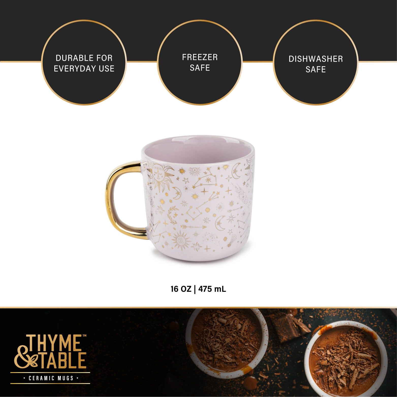 Stoneware Mug, 16 fl oz, Gold Stars is freezer safe, dishwasher safe, and made for everyday use. 16 fluid ounces is perfect for any at-home coffee and tea bar.