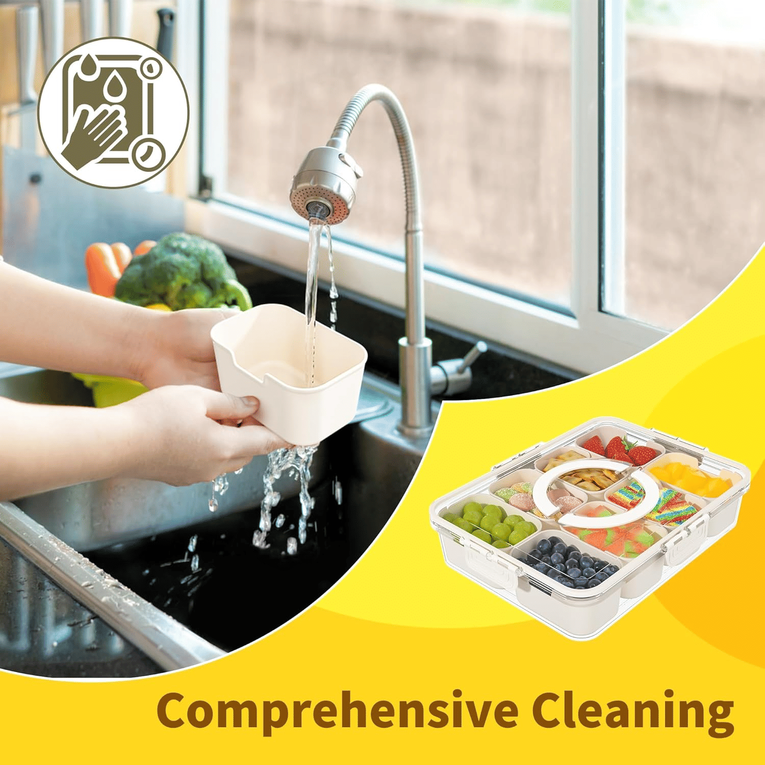 [Friendly reminder] The snack box container is not suitable for dishwashers or microwaves. This snack container can withstand temperatures ranging from -30 ° to 65 ° C, and can be used in a refrigerator. It is recommended to hand wash in water below 58 ° C. Please do not store hot food to prevent deformation and extend its service life.