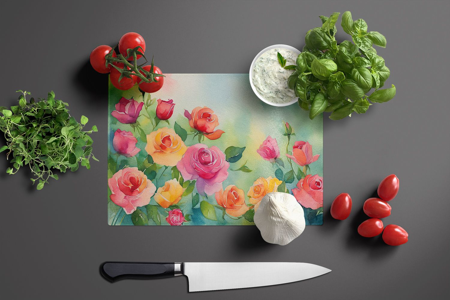 Glass Cutting Board featuring breed specific Roses artwork. Introduce your kitchen to the vibrant, large Decorative Glass Cutting Board from Caroline's Treasures. Crafted from resilient tempered glass, this board is not only a utilitarian necessity but also a colorful art piece. With its generous dimensions of 15 inches in height and 12 inches in length, it offers ample space for all your cutting needs. Every piece showcases captivating artwork from distinguished artists, bringing an aesthetic edge to your kitchen. Beyond its attractive design, this cutting board ensures your countertop stays pristine and unscathed, owing to its heat-resistant properties. Engineered with user convenience in mind, it features non-skid feet for stability, and rounded corners for additional safety. Its robust construction renders it virtually unbreakable, guaranteeing longevity. The board comes with protective feet bumpers, maintaining its position during use. This product is recommended to be hand washed only. Proudly printed and assembled in the United States, this cutting board exemplifies superior craftsmanship. With Caroline's Treasures' Decorative Glass Cutting Board, you're investing in a blend of functionality and artistic flair.
