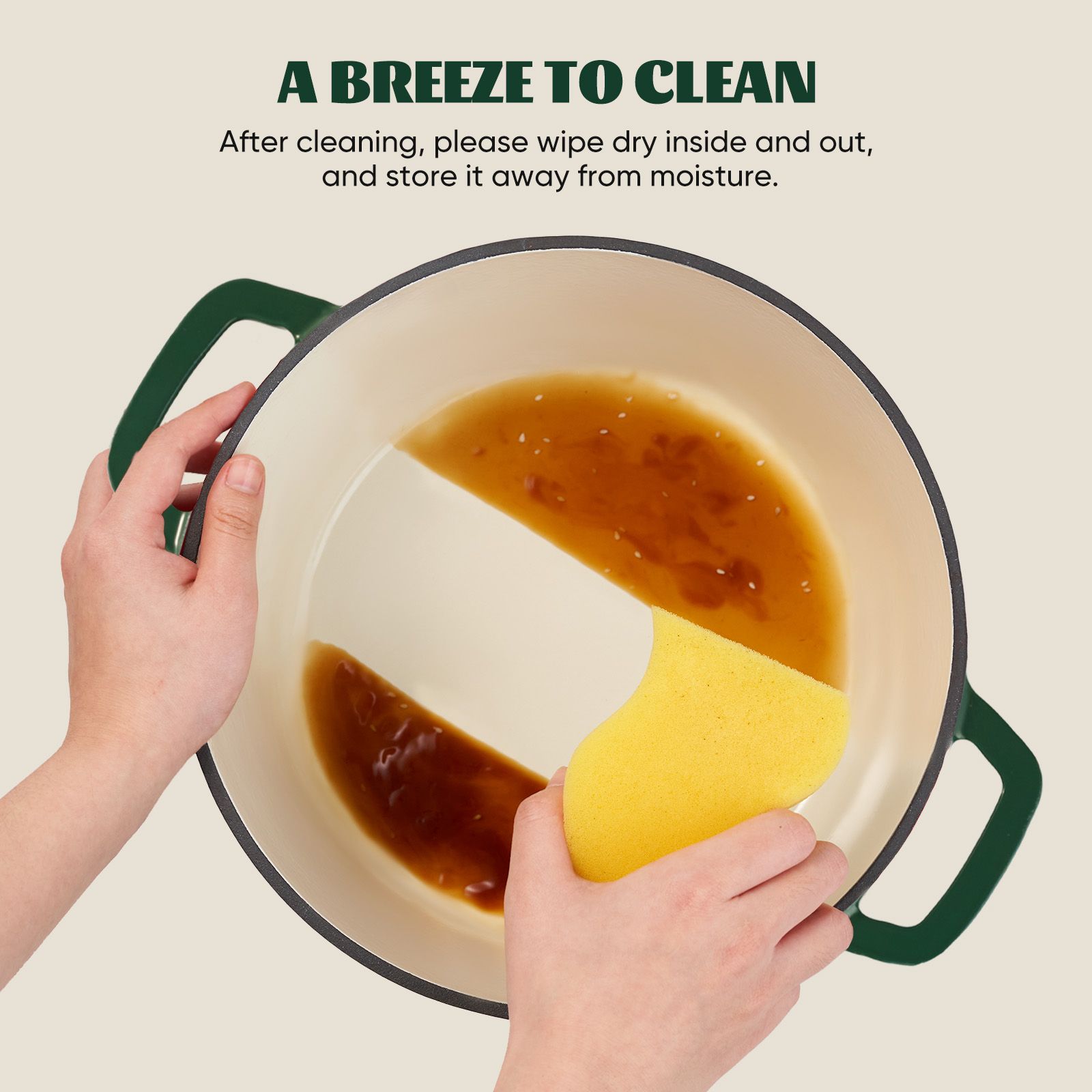 ��EASY TO CLEAN: This Dutch oven has a non-stick coating, it's easy to clean with soft sponge or cloth. If you want to remove difficult stains, soak in warm water for 1 to 2 hours or longer, and then use baking soda or neutral detergent to clean them off.Do not clean with a stainless-steel wire ball or other tools that may leave scratches.