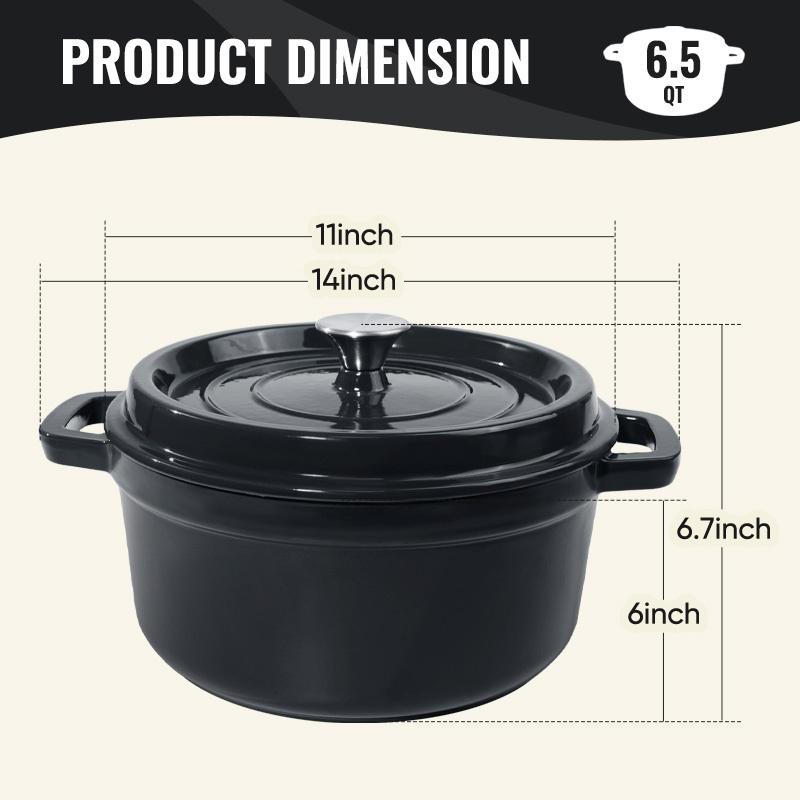 LARGE 6.5 QT CAPACITY:Our cast iron dutch oven can be used for multiple cooking methods such a cooking, baking, stewing etc.With this Large capacity enameled cast iron, can meet all the needs of family gatherings.The highest temperature tolerance is as high as 500°F.
