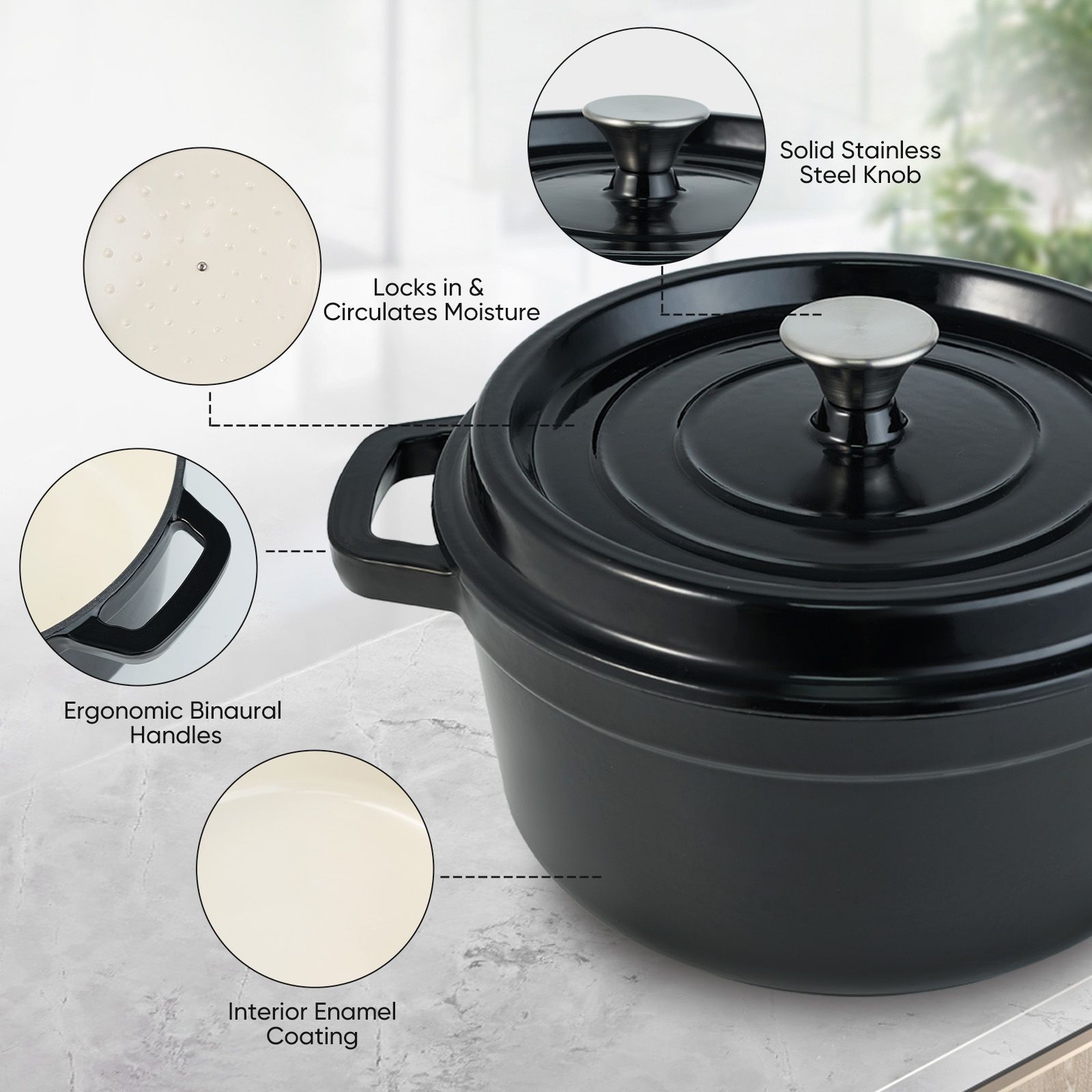 ENCLOSED THERMAL CIRCLE: This enameled dutch oven pot is design with circulating shower type lid, the raised design of the pot cover allows water vapor to circulate in the pot and locks the nutrition and moisture of the food, evenly fall on the food to maintain the original nutrition, possess pretty heat retention performance.