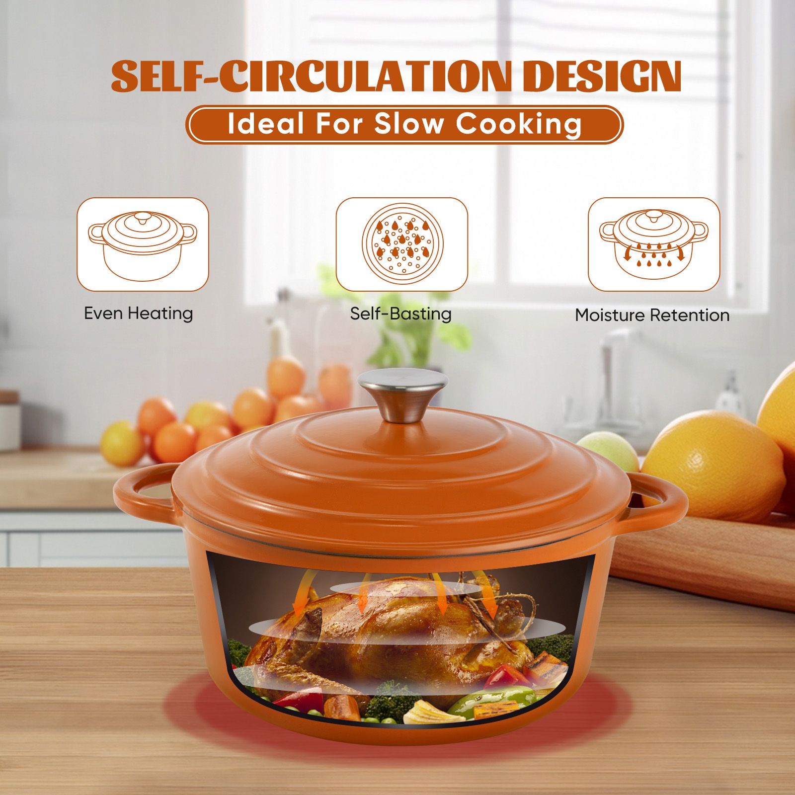 SPECIAL CYCLE DESIGN :This cast iron dutch oven has a special circular shower design. The water vapor circulates in the pot, which can better maintain the original nutrition of the food during cooking, and also provides the function of heat preservation.